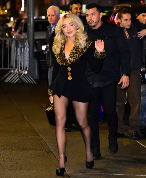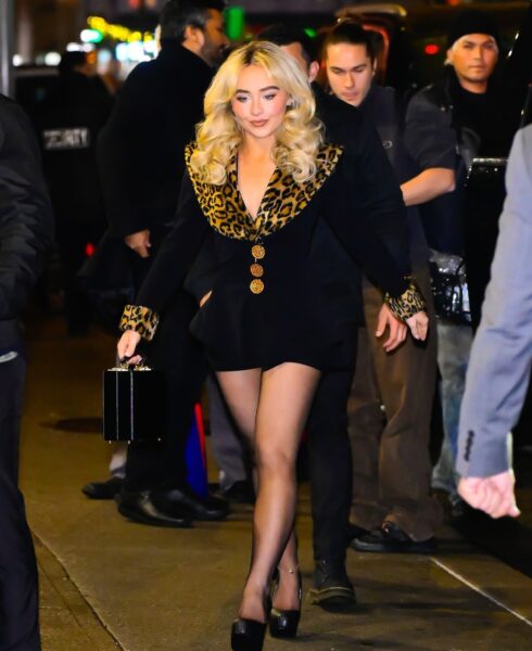 Choć nie jest to oficjalny czerwony dywan, stylizacja Sabriny bez problemu mogłaby się na nim odnaleźć. Towarzystwo ochrony i nocna sceneria sugerują wyjście o charakterze prywatnym lub branżowym, typowe dla nowojorskiego rytmu życia artystki — pomiędzy spotkaniami, kolacjami i wydarzeniami muzycznymi.