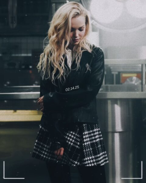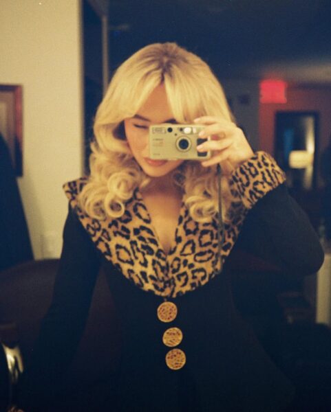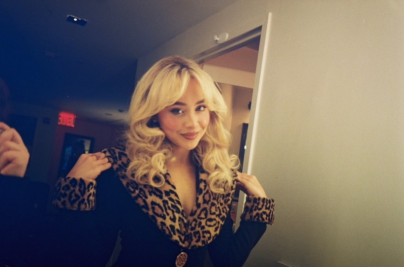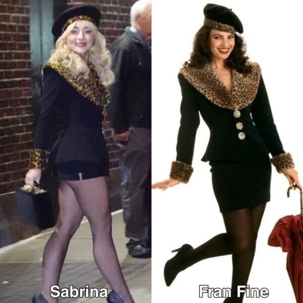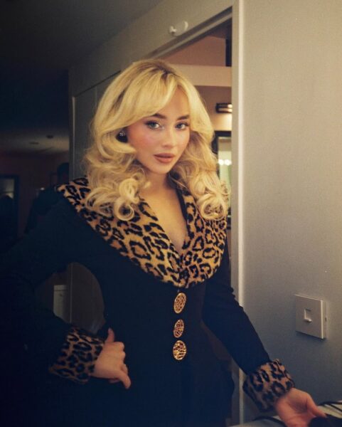 Centralnym elementem stylizacji jest czarna, krótka marynarka/sukienka o dopasowanym kroju, wyróżniająca się panterkowym wykończeniem kołnierza oraz mankietów. Ten drapieżny motyw nadaje całości charakteru i natychmiast przyciąga wzrok, jednocześnie mocno osadzając look w estetyce vintage i old Hollywood, z którą Sabrina coraz częściej jest kojarzona.