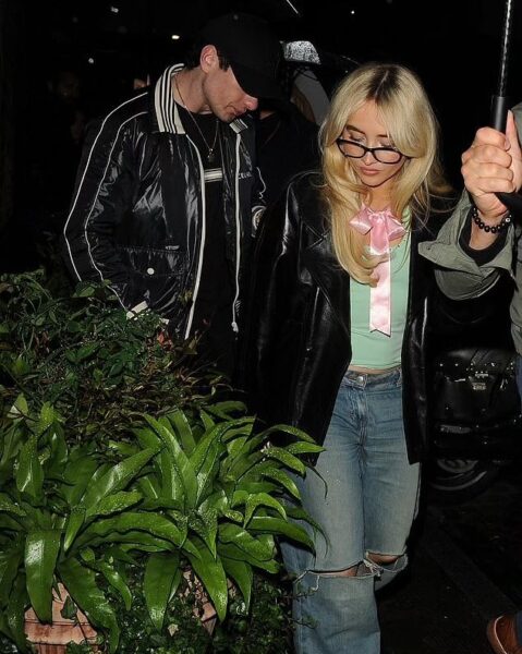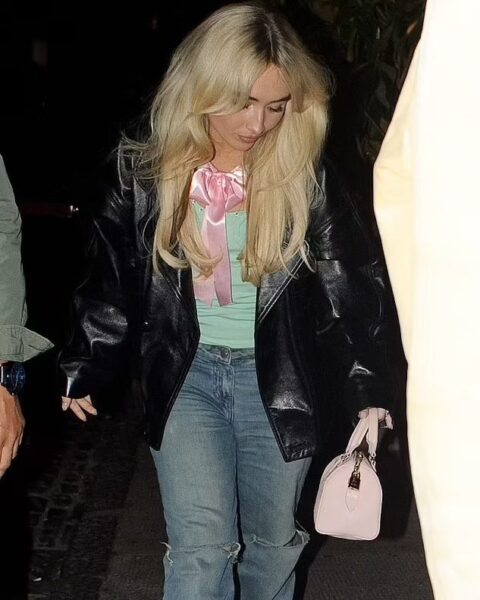 Bazą jest jasnozielony top, do którego dobrana została satynowa, różowa kokarda — detal w estetyce retro, miękki i bardzo charakterystyczny dla obecnej ery Sabriny. To akcent, który przyciąga uwagę, ale nie dominuje całości — raczej subtelny podpis niż manifest.