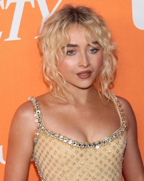 Na zdjęciu Sabrina pozuje na oficjalnej ściance wydarzenia, utrzymanej w charakterystycznej, intensywnie pomarańczowej kolorystyce sygnowanej logotypami Variety i Amazon MGM Studios. Jest to klasyczny red carpet moment, dokumentujący jej obecność jako zaproszonej gwiazdy i jednej z wyróżniających się postaci wieczoru.