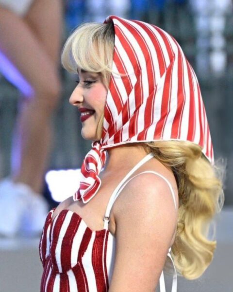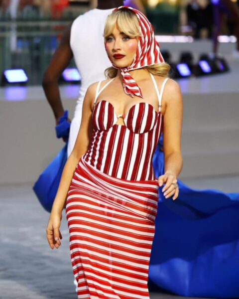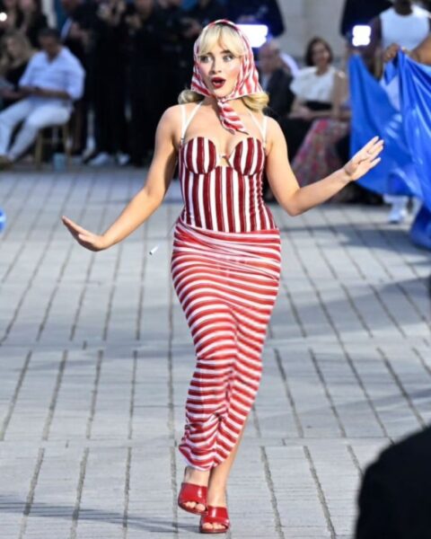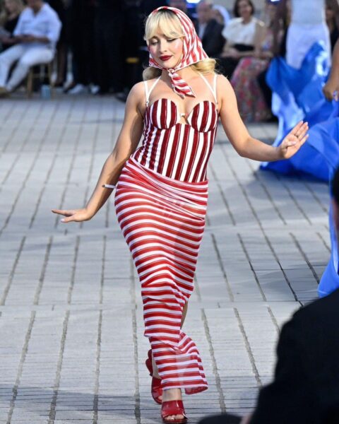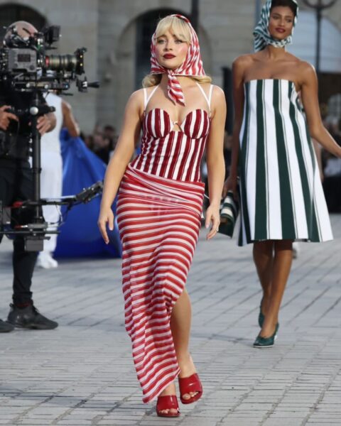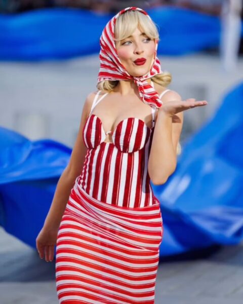 Czerwono-białe pasy, chusta zawiązana na głowie, sylwetka jak z pocztówki sprzed dekad — wszystko tu pracuje na skojarzenia z letnim Paryżem, dawnym kinem, pin-upową nonszalancją i modą, która nie potrzebuje sceny, bo sama ulica staje się wybiegiem. Ten look żyje ruchem: krokiem, gestem, spojrzeniem rzuconym gdzieś w bok, jakby akcja działa się dalej poza kadrem.