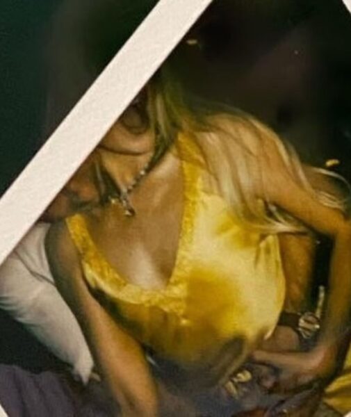 Tym razem wybór padł na złotą, satynową mini sukienkę o prostym, bieliźnianym kroju, wykończoną delikatnymi zdobieniami przy dekolcie i talii. Materiał subtelnie odbijał światło fleszy, nadając całości ciepły, niemal filmowy charakter — idealnie pasujący do nocnych ujęć zza szyb auta. Stylizacja była oszczędna, ale wyraźnie przemyślana: bez nadmiaru dodatków, za to z mocnym naciskiem na fakturę i kolor.