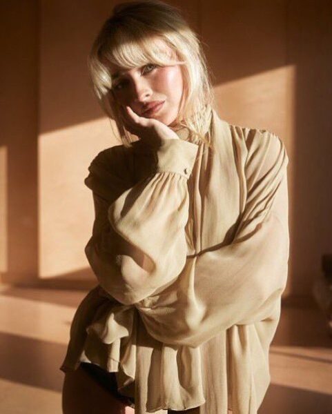 Sabrina występuje w luźnej, zwiewnej bluzce w odcieniach beżu i jasnego karmelu. Materiał jest lekki, półtransparentny, z delikatnym połyskiem, który pięknie reaguje na światło.