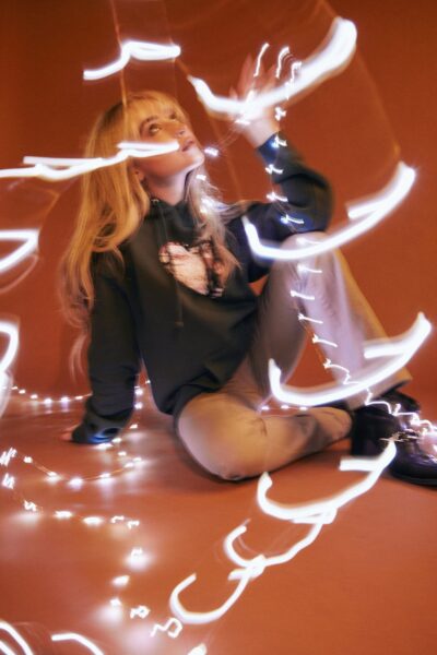 Pozowanie: intymne, spokojne, czasem niemal „domowe” — siedzenie na podłodze, miękkie gesty, kontakt wzrokowy