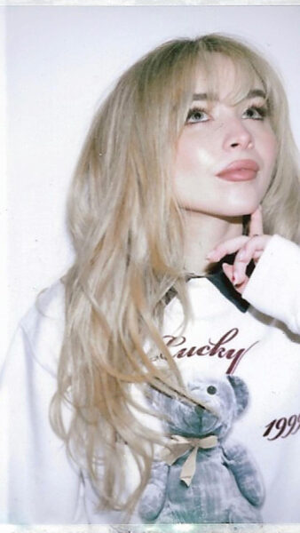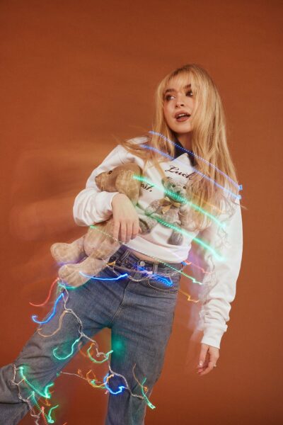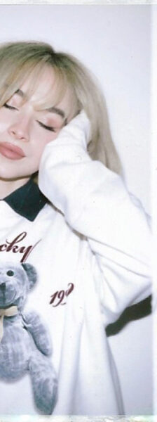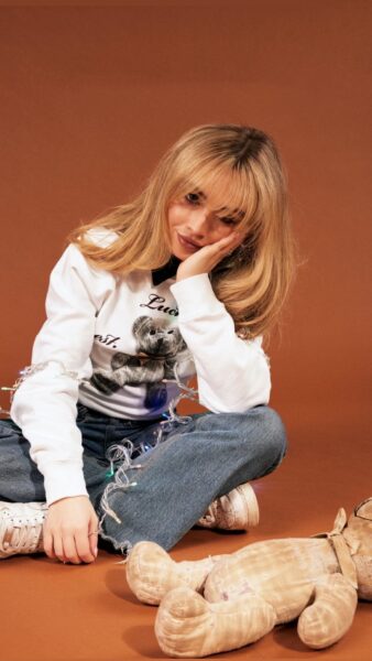 To jedna z pierwszych sesji, w których Sabrina świadomie operuje kontrastem: słodkie symbole (miś, bluza) vs. dorosła, pewna siebie mimika.
