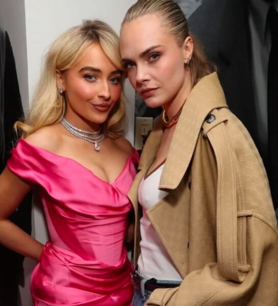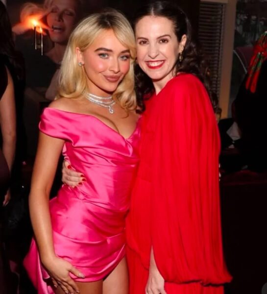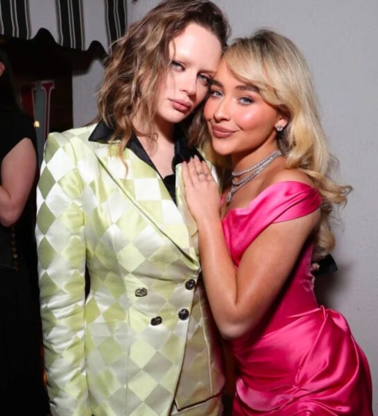 Sabrina pokazała się w różowej mini-sukni off-shoulder projektu Vivienne Westwood (model: Nova Cora crêpe satin), do tego modne sandały platformy marki Stuart Weitzman i biżuteria – naszyjnik z diamentami marki Azature. Stylistą był Jared Ellner.